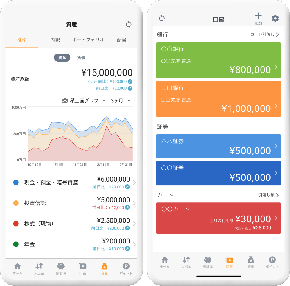 銀行や証券口座、クレジットカードなどのデータを自動で取得し、最新の資産状況を常に確認できます。