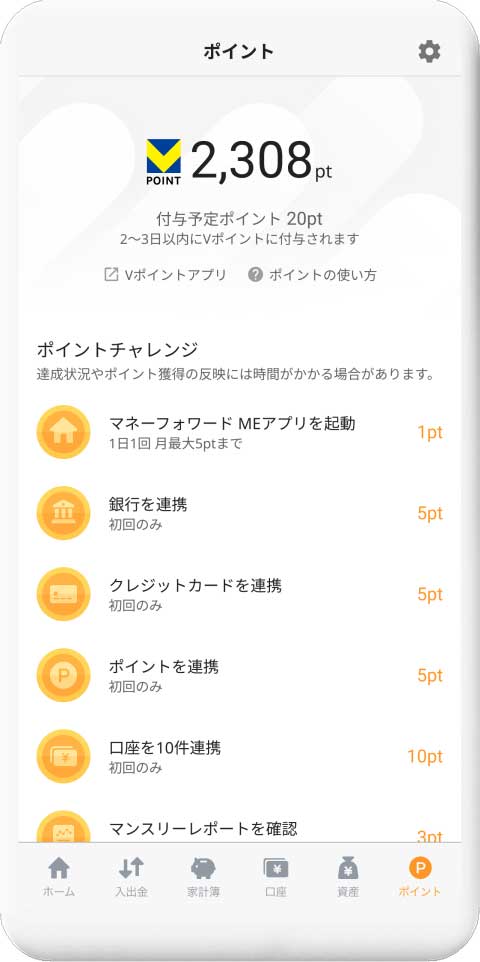 マネーフォワード ME アプリ版サービスでポイントチャレンジを達成すると、ポイントを獲得できます。