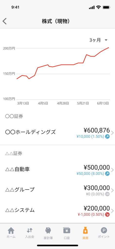 銘柄ごとの推移や損益状況もグラフですぐにわかるので、家計管理から資産管理までスムーズに行えます。