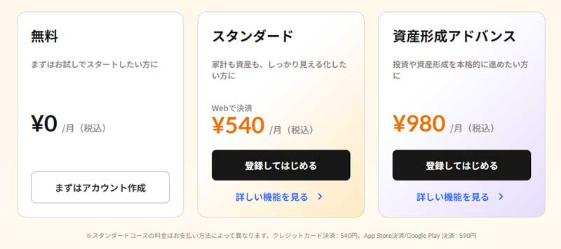 マネーフォワード MEでは「無料コース」「スタンダード」「資産形成 アドバンス」3つのコースが用意されています。
