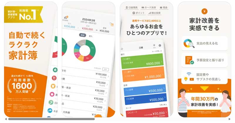 銀行口座やクレジットカード、証券口座など、2428件の金融サービスと連携が可能なことで、お金の出入りや資産状況を自動で記録・見える化してくれます。