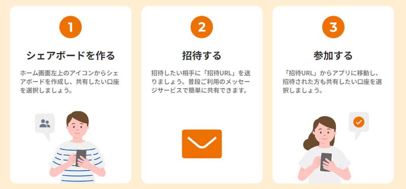 「シェアボード」は、パートナーや家族と共同の生活費口座など、必要な口座やカードのみを共有して管理できる機能です。
