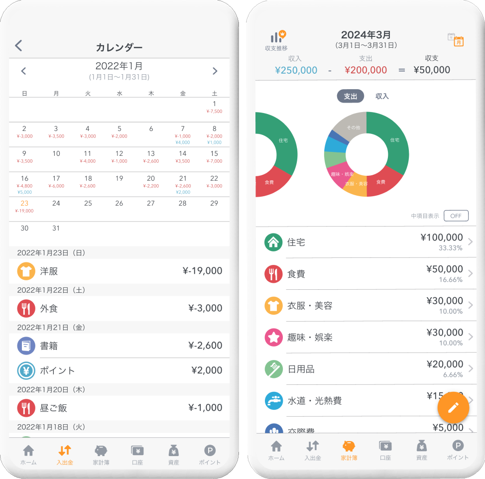 「今月は外食に行き過ぎかも?」「光熱費を節約しなきゃ!」などが一発でわかるので、家計の改善や、未来のイベントのために計画を立てたりすることに役立ちます。
